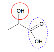 D'après les définitions des groupes hydroxyle et carboxyle, la molécule d'acide lactique contient un groupe hydroxyle entouré en vert, et un groupe carboxyle entouré en bleu (pointillets). | ![]() |